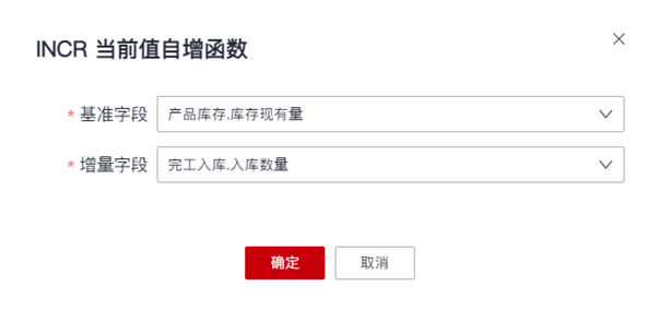“基准字段”参数选择输出模型“仓库-产品库存”的“库存现有量”字段(可获取相应仓库产品的当前库存量),“增量字段”参数选择“完工入库单”的“入库数量”,实现在仓库下某产品的当前库存量上增加“入库数量”。
