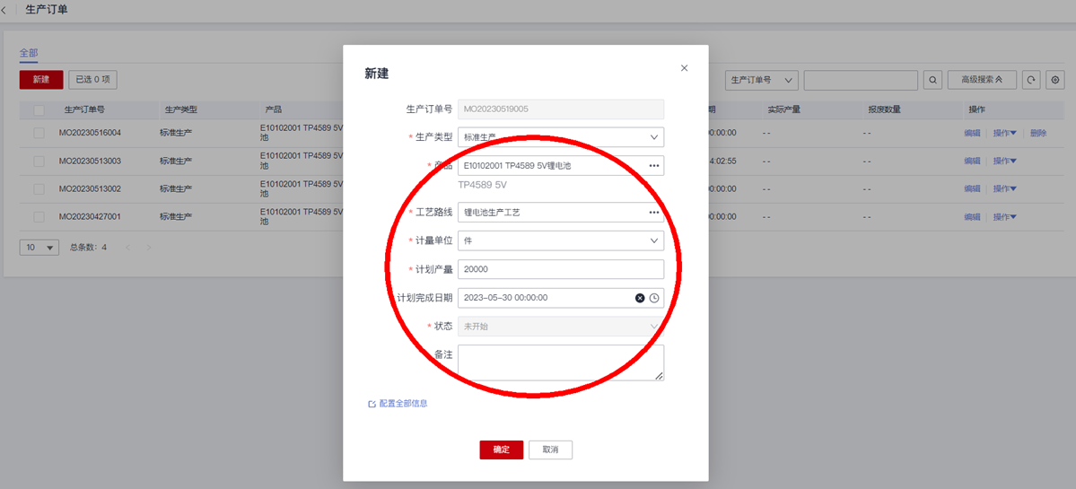 创建一个生产订单,录入订单的生产“产品”、“工艺路线”和“计划产量”等字段信息: