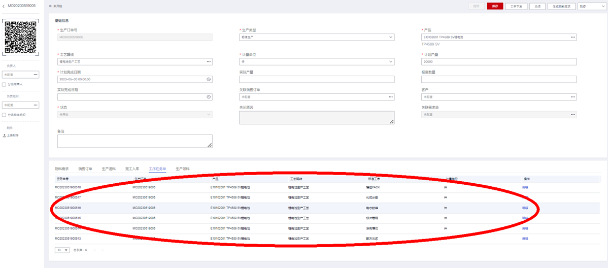 保存“生产订单”后,进入创建的生产订单的详情编辑页面,查看验证是否同步创建相应的工序任务单: