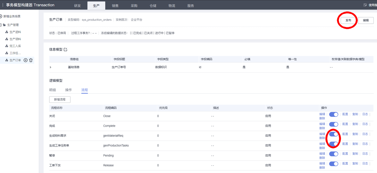 至此,我们完成了案例场景的4个业务逻辑流的建模配置,逻辑流建模完成后,需要启用发布逻辑流以及所属的业务模型,逻辑流才会生效: