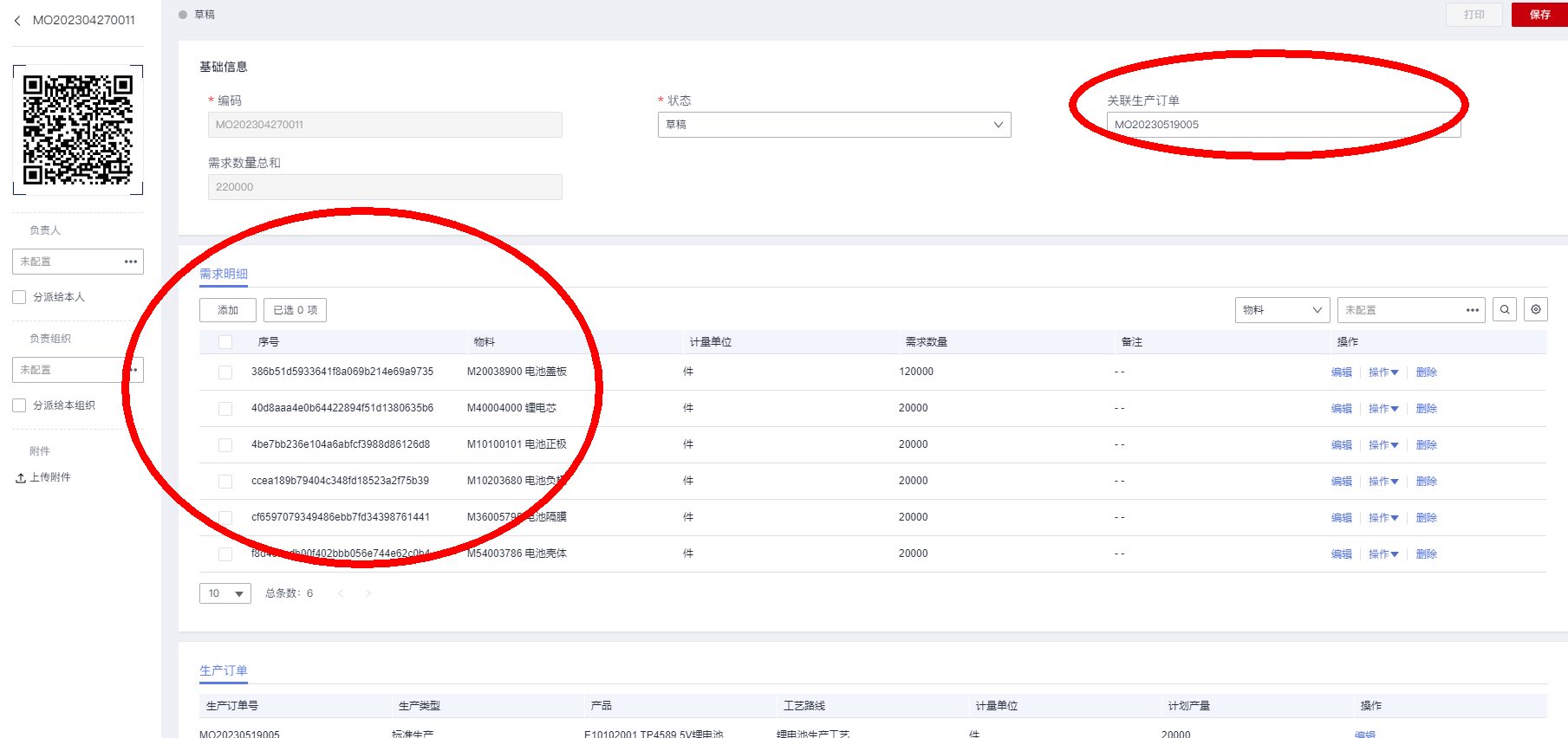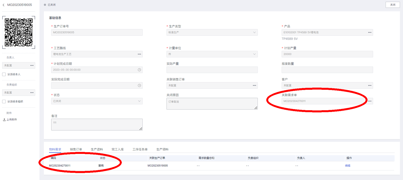 4.创建的物料需求单号,需要回填更新“生产订单”: