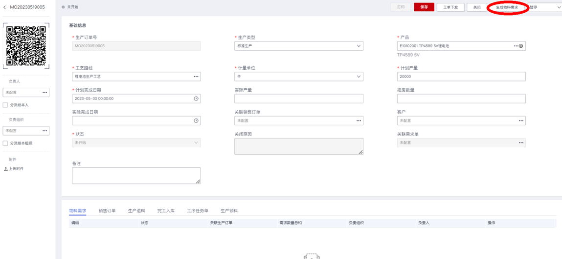 然后点击“生成物料需求”按钮,等待执行完毕后,查看是否生成了相应的物料需求单、生产订单上的“关联物料需求单”字段值是否已自动回填更新,以及“生成物料需求”按钮是否已不可见: