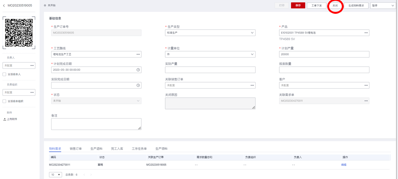 使用上一步创建的生产订单,验证是否有“关闭”的操作按钮: