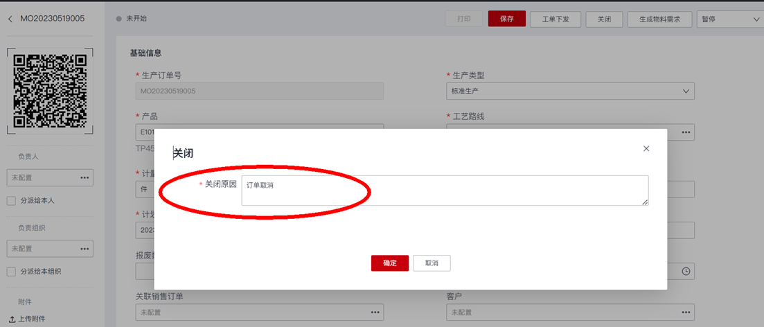 - 生产订单关闭:在生产订单上提供操作“关闭生产订单”,用户操作时需要填写“关闭原因”,更新生产订单以及其下的工序任务单的状态为“已关闭”;