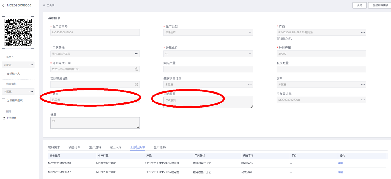 确定后,验证生产订单、以及相关工序任务单的状态是否已自动更新为“已关闭”: