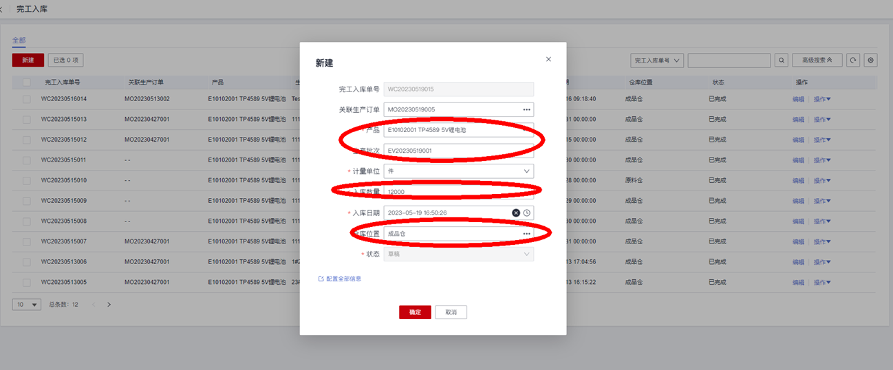 创建一个“完工入库单”,录入订单的生产“产品”、“入库数量”和“仓库位置”等字段信息: