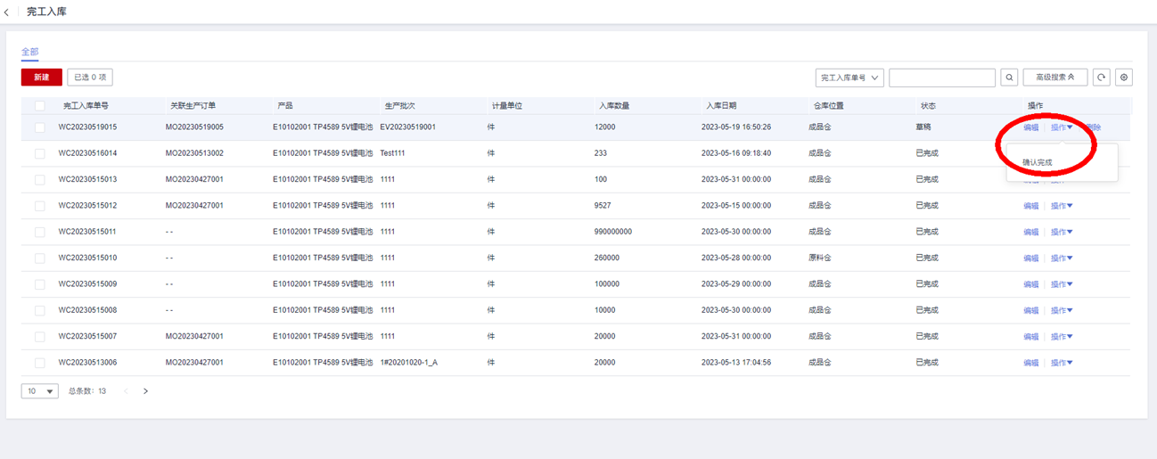 保存“完工入库单”后,在完工入库单的数据查看页面,点击操作,然后选择“确认完成”: