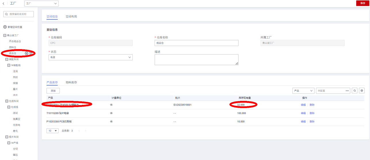 在“工厂>仓库”主数据功能,查看“成品仓”仓库下产品的现有量是否增加: