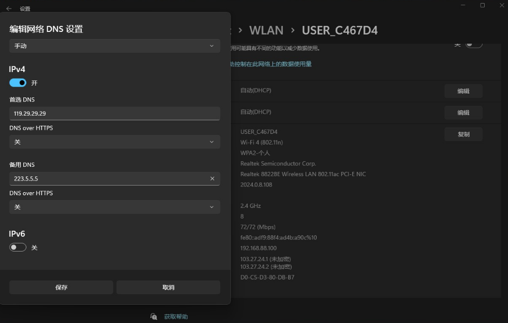 windows系统在设置,网络和internet,已连接网络属性,dns服务器分配,编辑添加。