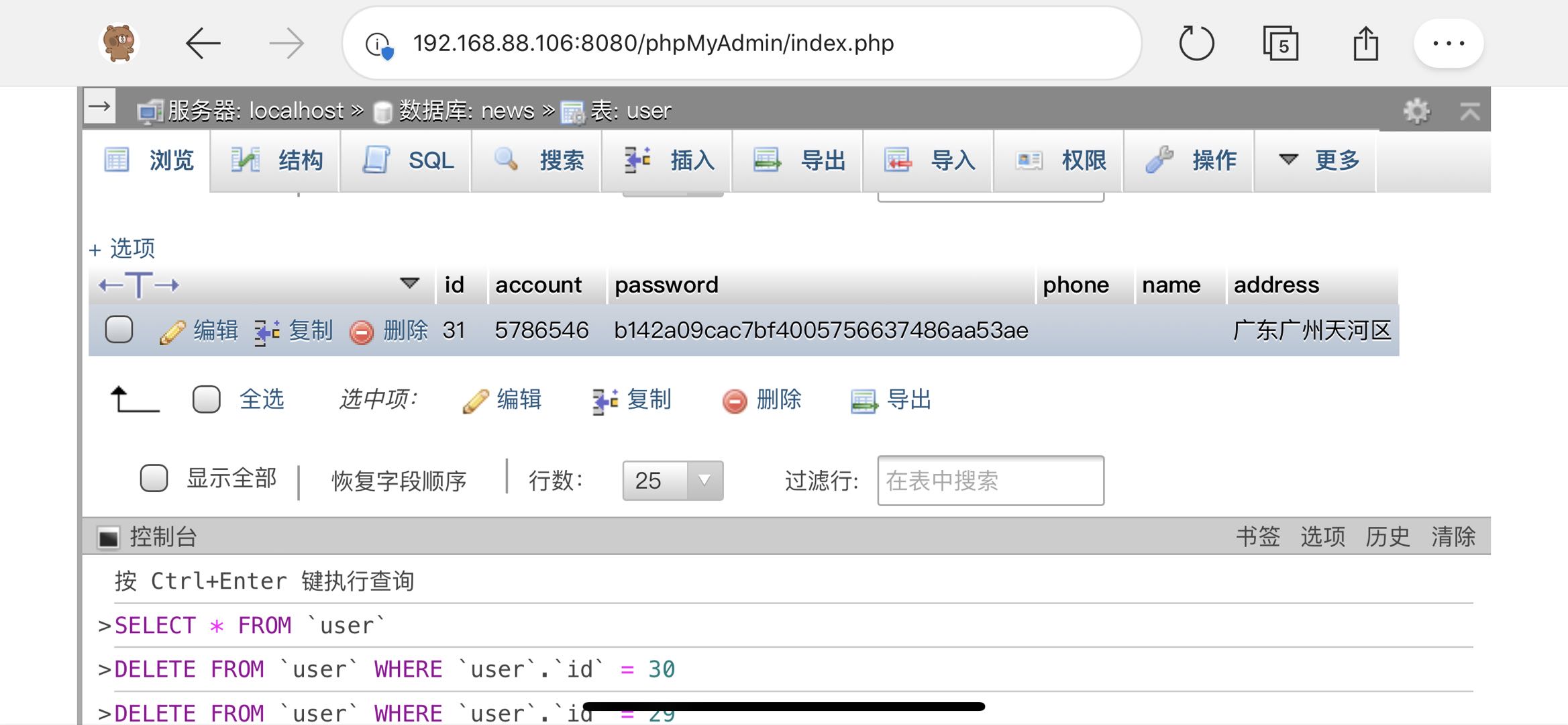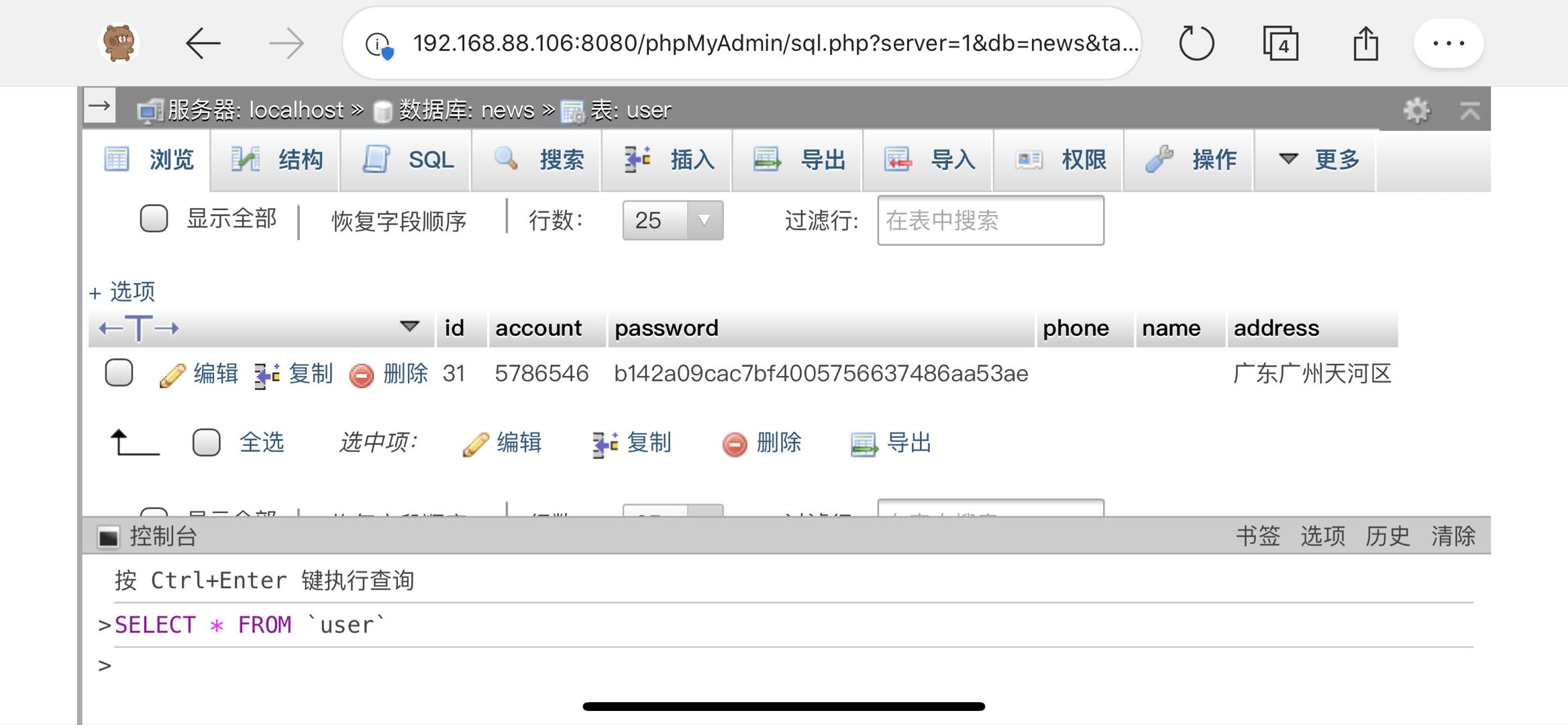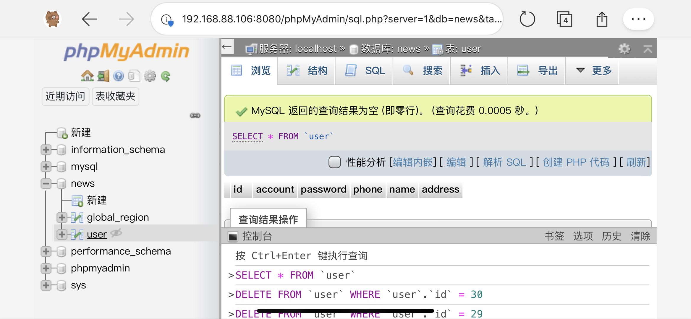 打开数据库,查询news数据库下的user表信息,可以看出空空如也。