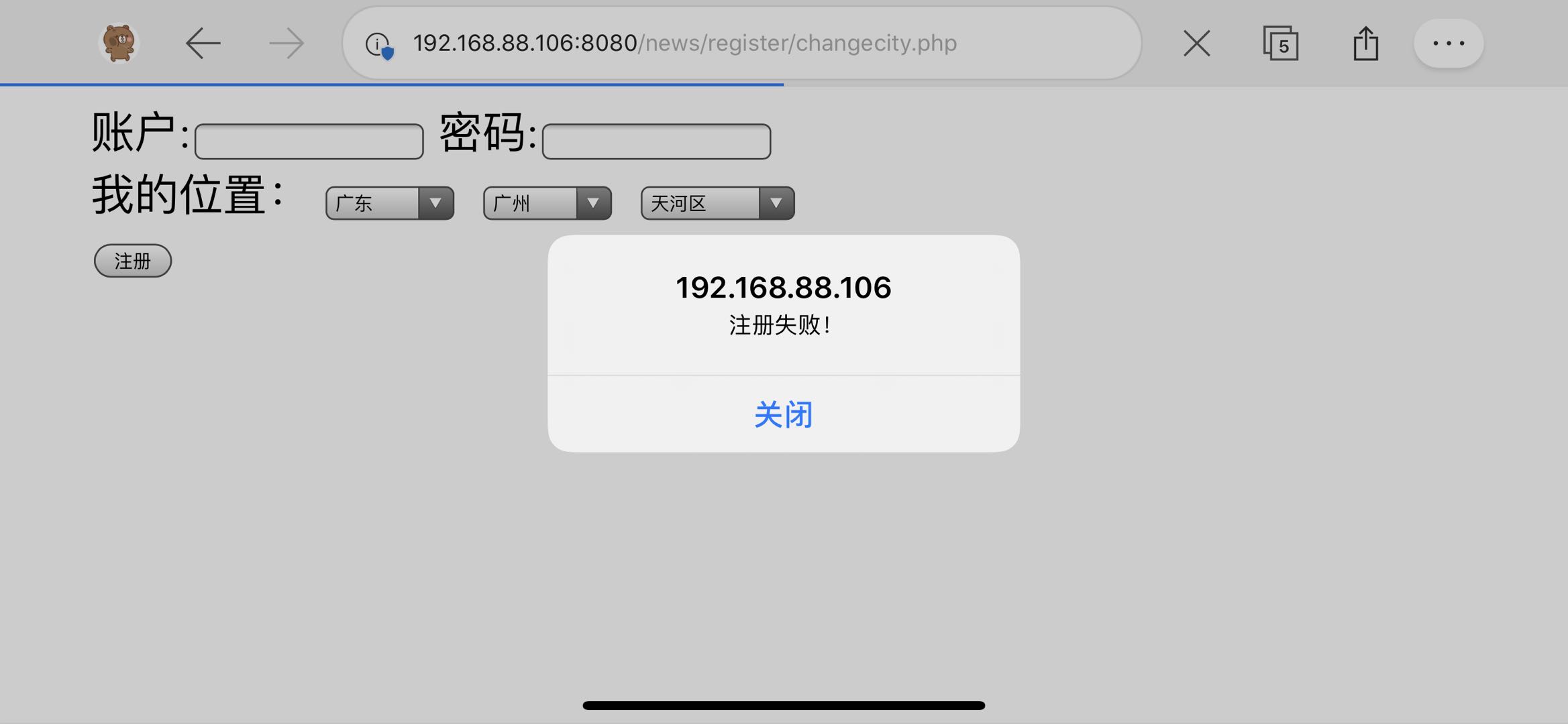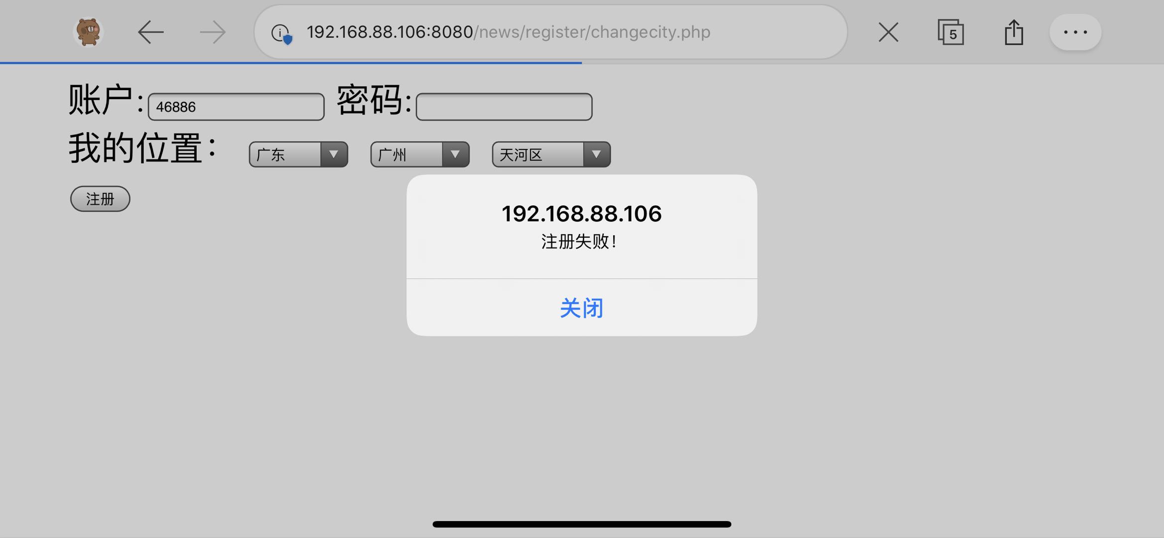 运行浏览器,打开注册页面,仅输入省市区信息,返回注册失败。