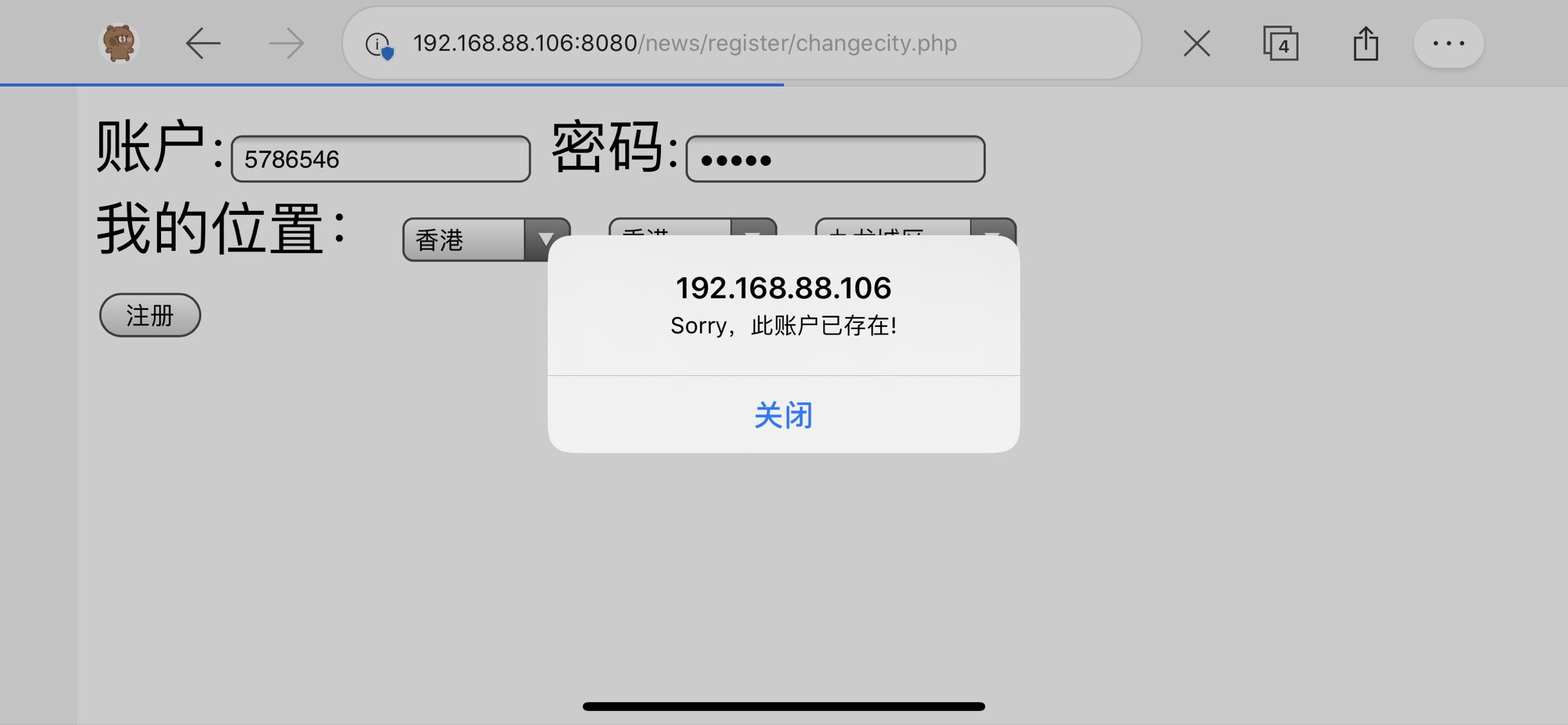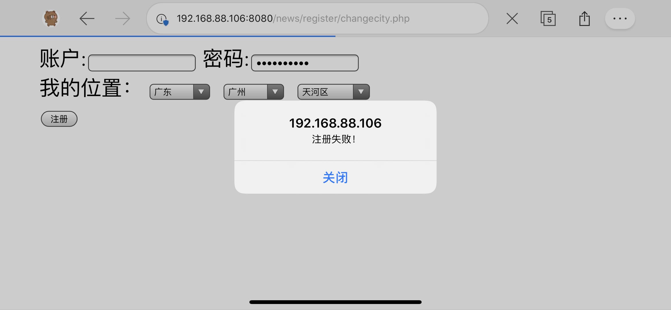 同理,输入密码和省市区信息,依然返回注册失败,数据库并无非法信息写入。