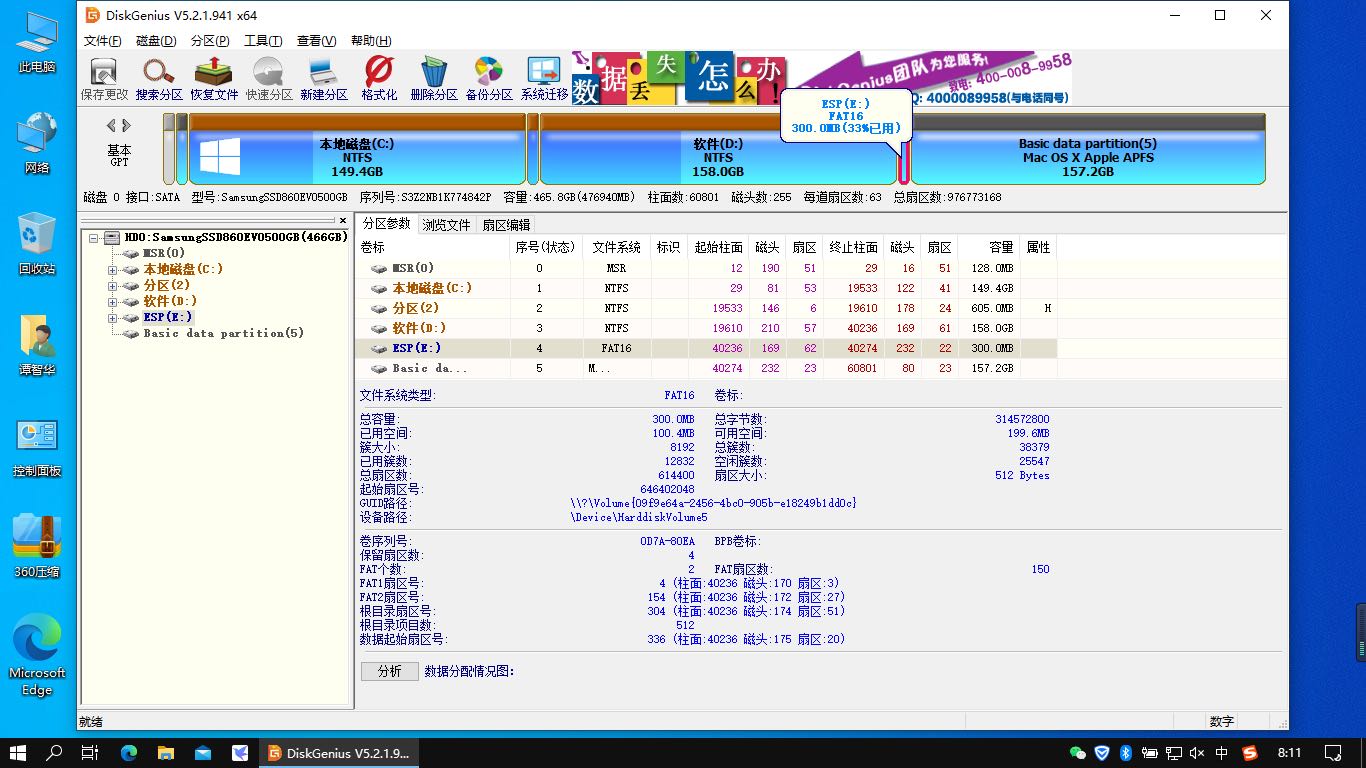 打开Diskgenius磁盘分区工具.在一个空闲磁盘空间格式化后.新建一个约300MB的新分区.并格式化为esp格式。