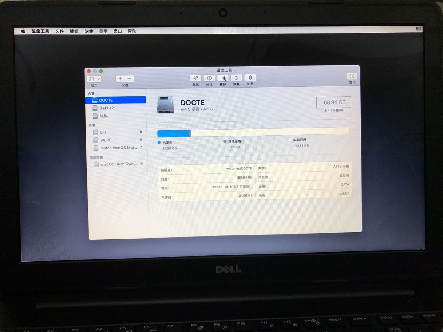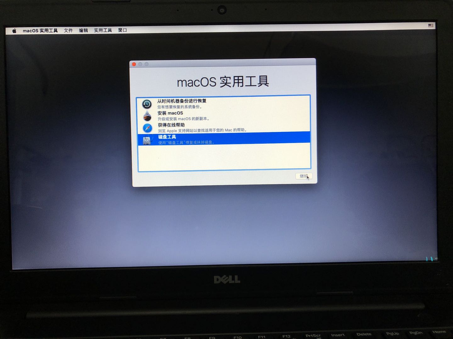 选择磁盘工具 抹掉预装macOS磁盘。
