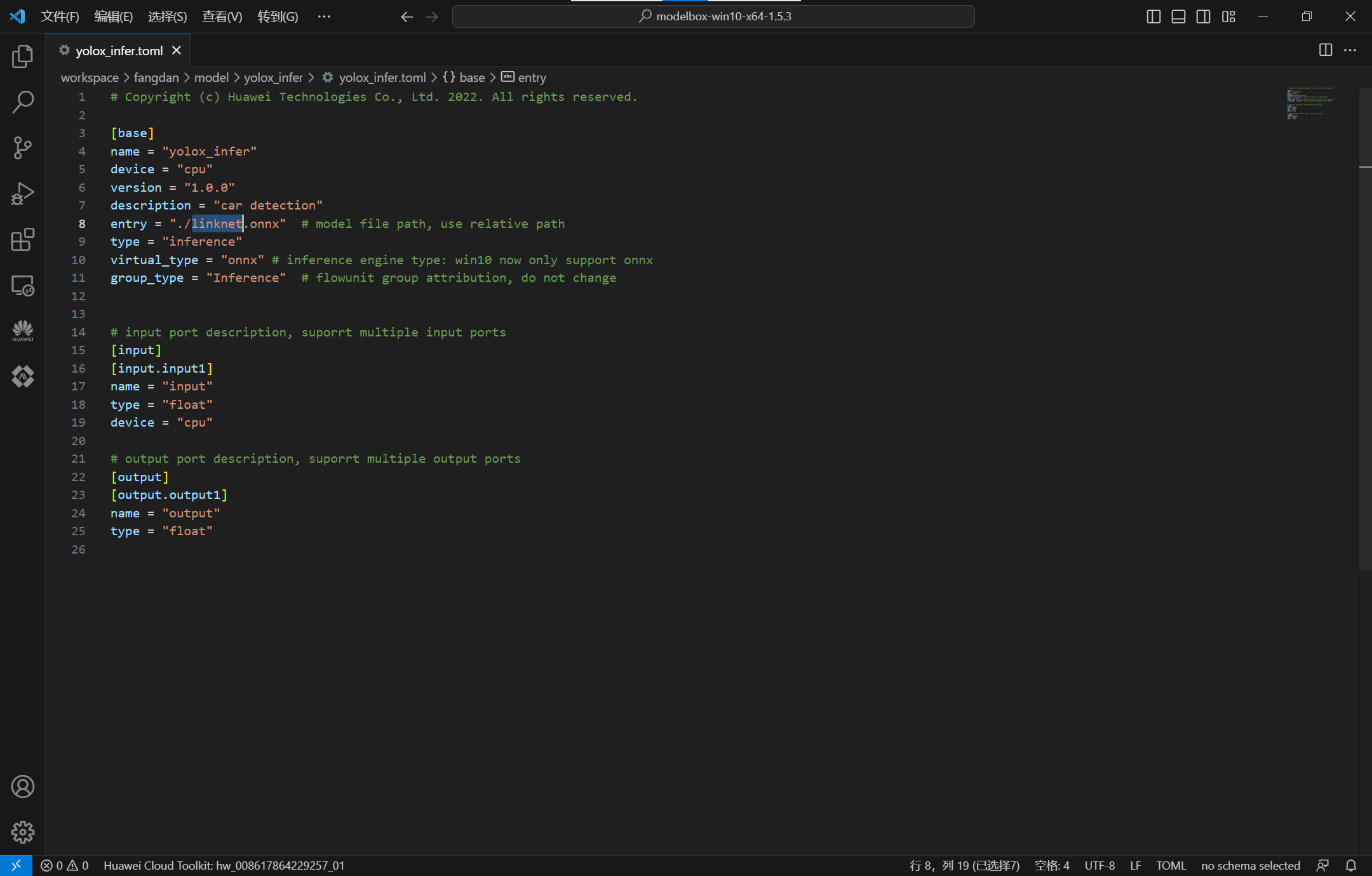 将我们导出的模型linknet.onnx放到yolox_infer目录下,接着编辑.toml配置文件,主要修改模型路径,对配置文件编辑如下: