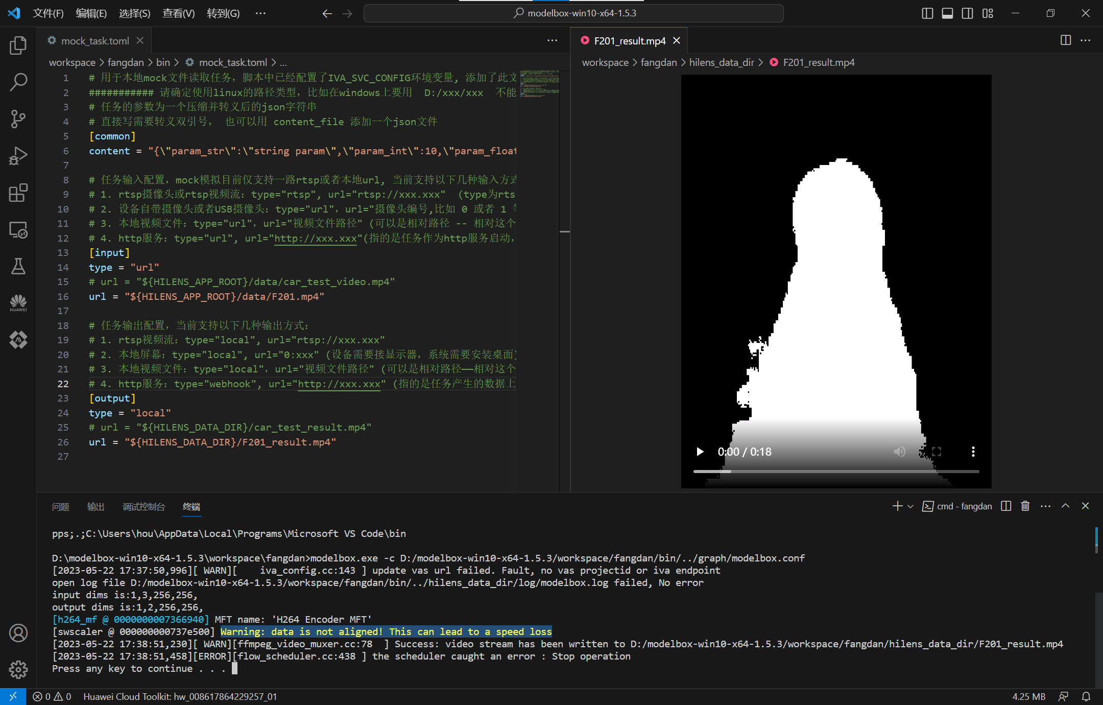 修改mock_task.toml输入输出配置,执行bin/main.bat运行应用,测试视频人像分割效果: