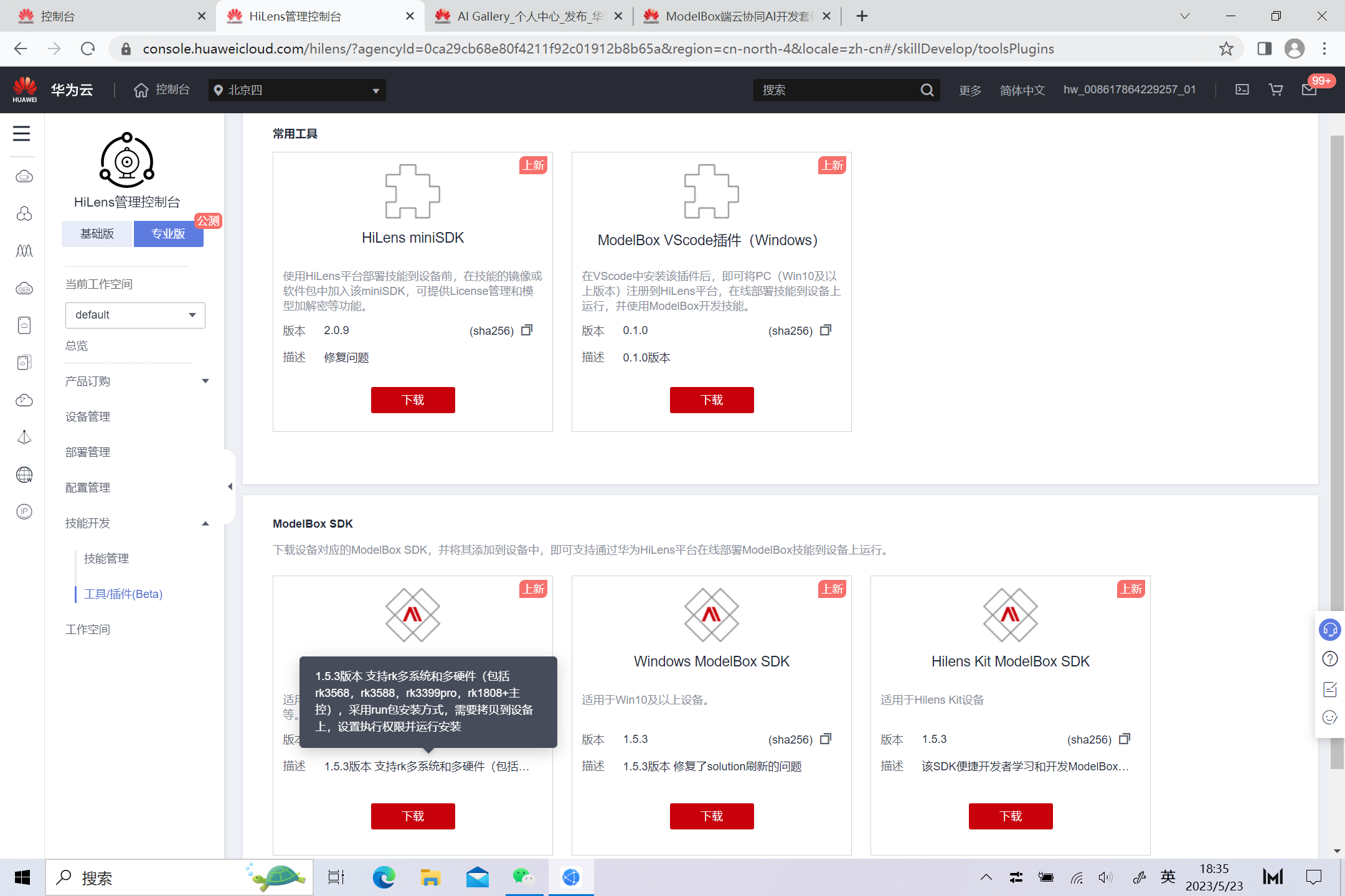 在Hilens平台下载对应设备的插件,目前ModelBox SDK 1.5.3支持rk多系统和多硬件(包括rk3568、rk3588、rk3399和rk1080),选择对应版本下载安装即可: