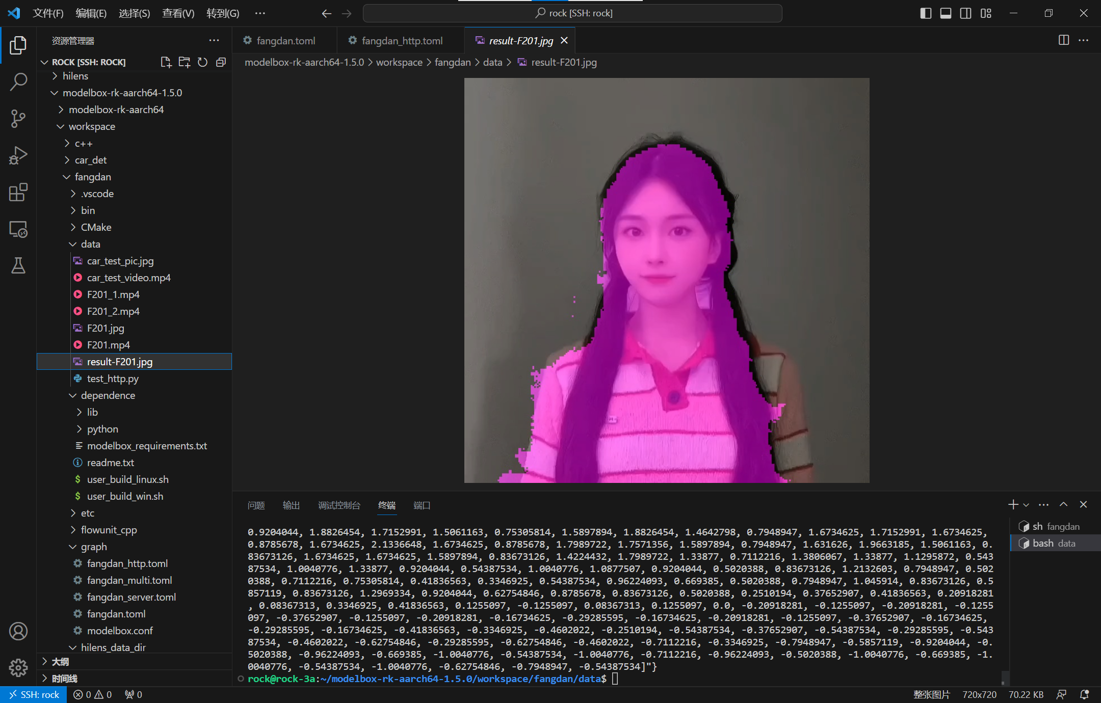 使用root账号运行fangdan_http.toml流程图,然后在vscode中打开另一个终端,执行test_http.py脚本,将在fangdan/data下生成测试图片的推理结果: