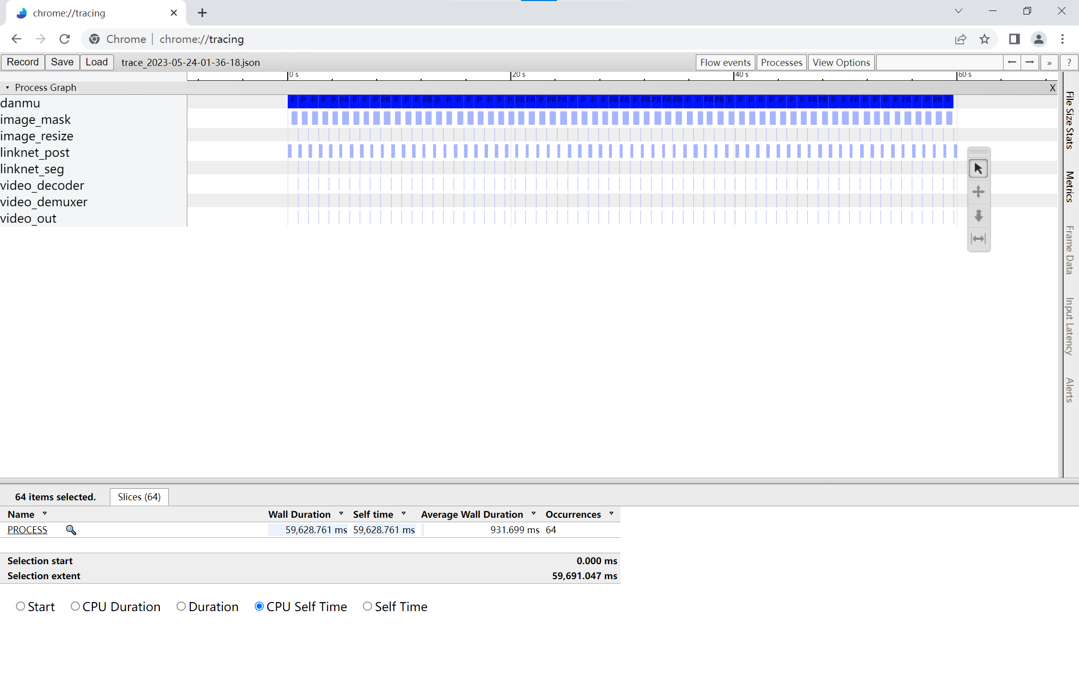 运行流程图后,会生成性能相关的json文件,通过将json文件加载到浏览器中即可查看timeline信息。