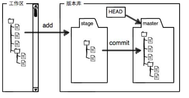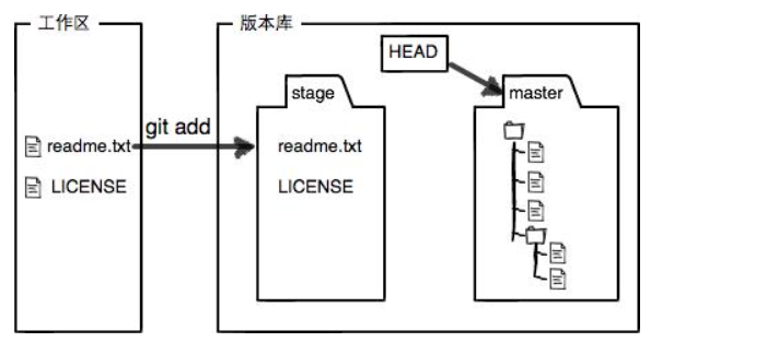 Git的版本库里存了很多东西,其中最重要的就是称为stage(或者叫index)的暂存区,还有Git为我们自动创建的第一个分支master,以及指向master的一个指针叫HEAD。