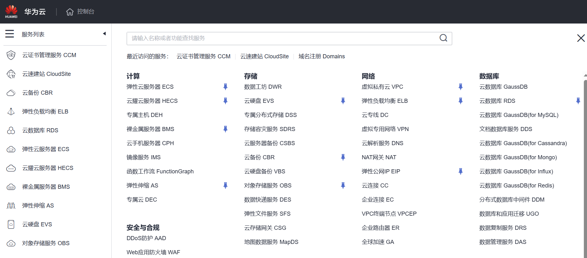 选择左上角的服务列表(三个横杠图样),选择云证书管理服务,若没有此项则在搜索栏中进行搜索,搜索到后在文本后可点击蓝色图钉样式即可固定在左侧栏中