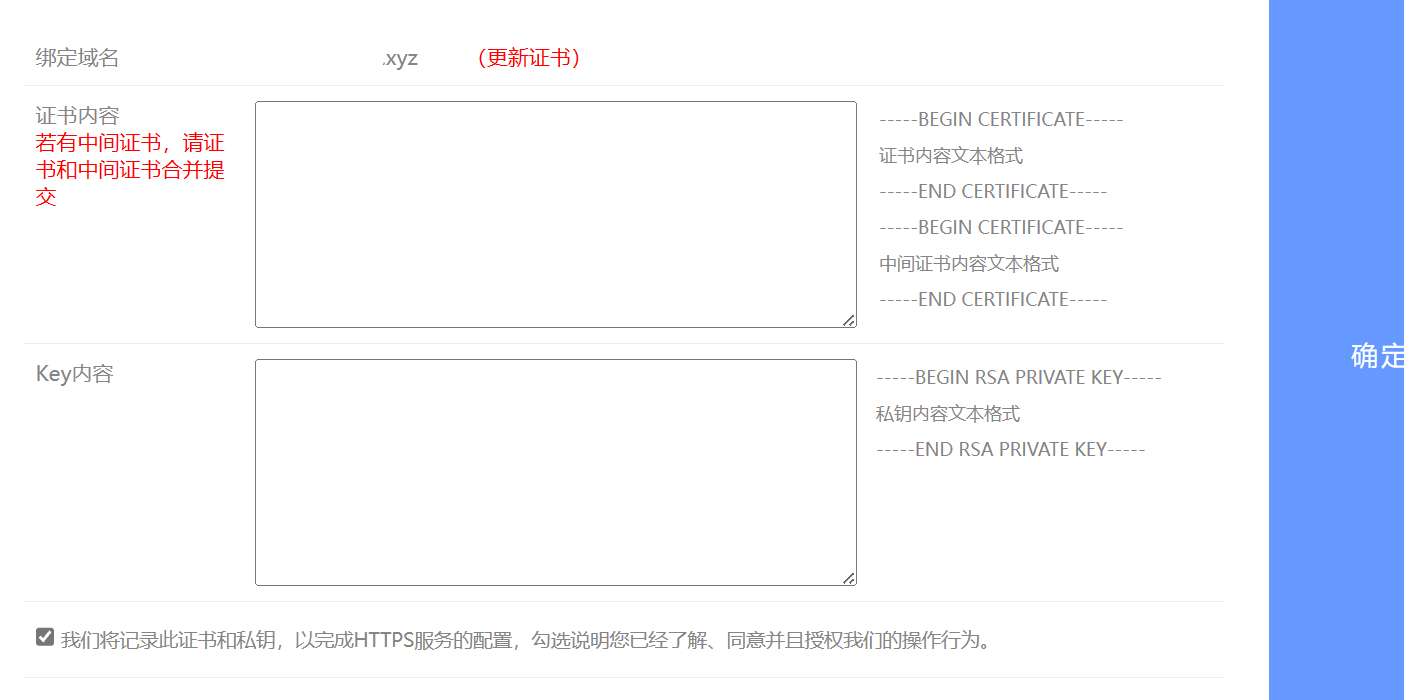 将刚刚_Nginx后缀的文件夹中的.crt后缀文件以文本编辑器方式打开,打开后将其中的内容复制粘贴到第一个输入框中。将.key后缀文件以文本编辑器方式打开,打开后将其中的内容复制粘贴到第二个输入框中。