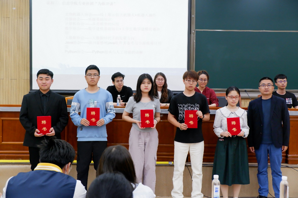 活动中校领导对学院专业榜样进行颁奖,为参与信息学院科技文化月“为你开讲”活动的北物机器人协会、传媒协会、计算机协会、数学协会、大数据协会、Java协会、Python协会的社团团长颁发聘书,鼓励学生多元化发展。
