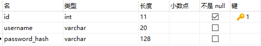 模块全部安装完毕,首先要做的准备工作是在 MySQL 数据库中建立 users 表,结构相对简单,仅包含 2 个字段即可。
