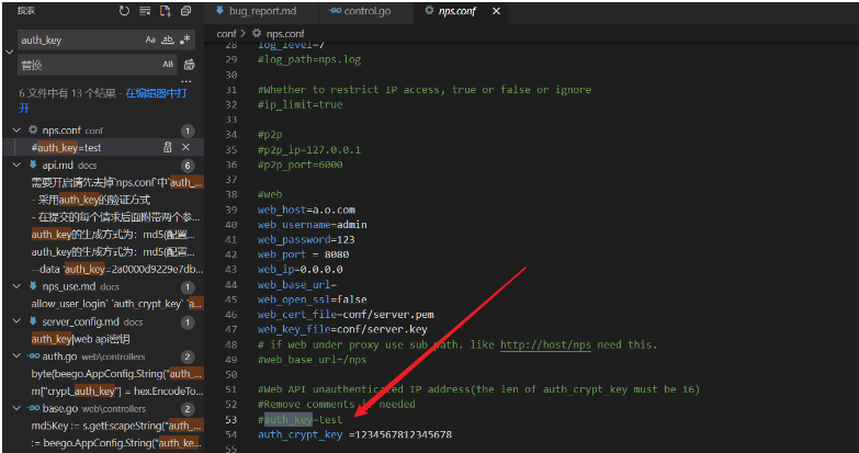 而在nps.conf配置文件里,auth_key默认是被注释掉的
