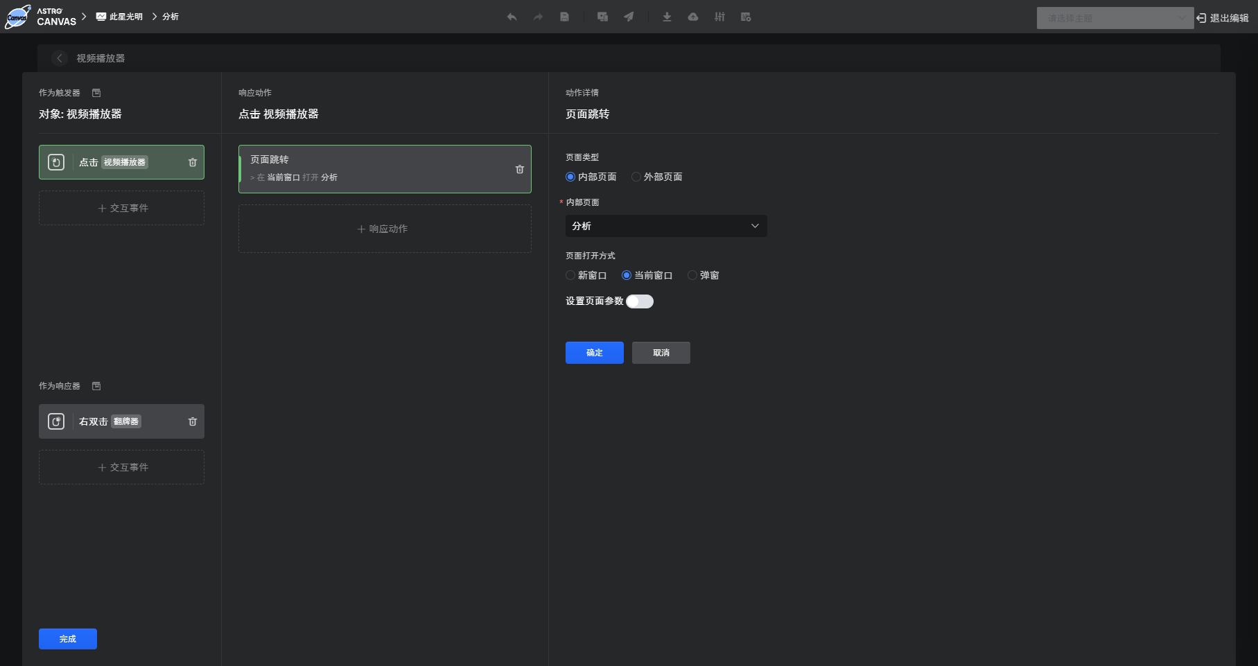 在视频播放器:这里我们可以通过放置鼠标在组件上来设定数据来源和交互式操作的具体过程,交互式操作主要包含的是单机左键和右键、双击或者滑过等交互式操作,可以选择页面内部和外部的链接进入,也可以选择是否跳转到新的窗口。
