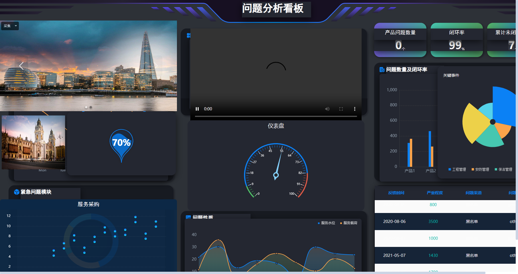 紧接着我们会进入一个界面,界面一景将大屏进行装饰好了,界面上是多个部件构成的模块化操作,右小角我们可以放大和缩小进行缩放,左侧则是组件模块,主要分为图表、媒体、底图、文本、装饰、仪表盘、其它、导航和收藏几个功能组件。每个里面都有很多的功能,图表有几十种可选,包含了丰富的散点图、折线图、柱状图等,