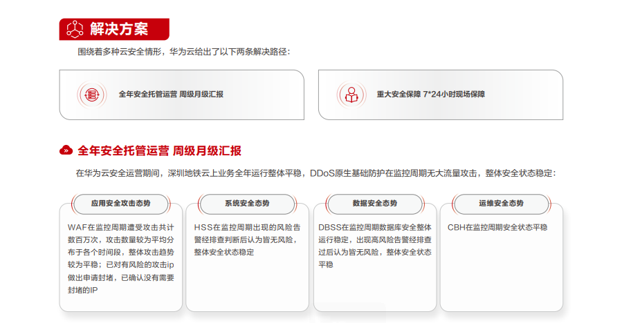 对于深圳地铁云上安全运营中,特别是在保障客户核心业务方面(地铁乘车码、费用补缴、线路规划等),华为云安全运营团队协助响应各类入侵事件、安全咨询、加固建议等数百次,发送各类漏洞利用预警排查几十次,完成堡垒机僵尸账户进行梳理,并告知风险;同时全年监控上,涵盖DDoS攻击、Web应用类攻击、主机渗透攻击如暴力破解等影响业务安全稳定性的攻击活动。