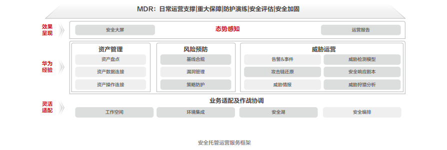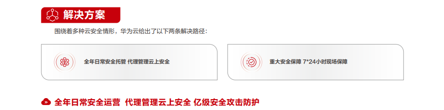 安全托管运营是结合华为30年安全经验积累,可完成安全评估、托管、保障、辅助运营全套防护措施,帮助企业实现对安全风险与安全事件的有效监控,降低安全风险并消除安全事件带来的损失。其中安全托管可保障客户在公有云上全年日常的安全服务。而重大安全保障,可针对大型会议、重大事件、攻防演练,提供安全保障支撑。