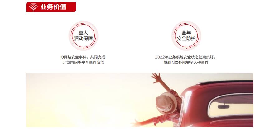 针对该车企的安全托管运营,主要通过实时处置安全风险、365天持续监控两大举措来保障该车企全年安全运营。在实时处置安全风险上,协助业务响应各类入侵事件、安全咨询、加固建议等数百次,发送各类漏洞利用预警排查几十次,以季度为周期完成堡垒机僵尸账户进行梳理,告知风险;在365天全年监控上,涵盖DDoS攻击、Web应用类攻击、主机渗透攻击如暴力破解等影响业务安全稳定性的攻击活动。