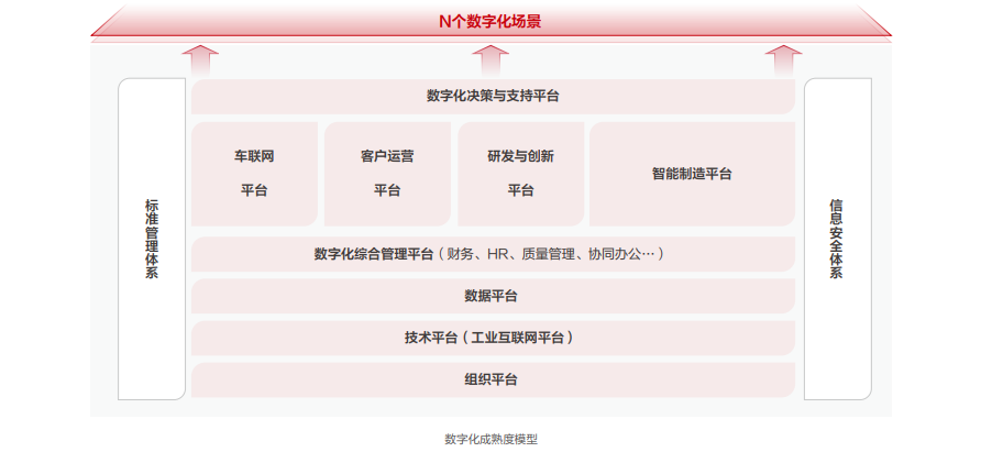 从组织-技术-数据平台,贯穿数字化转型从探索期到深水期各个阶段。组织平台即组织变革,通过体系建设、制度设立、部门分工、流程改善等多方面让企业内部上下齐头并进,共同出力。而技术平台是为了实现对当前数据中心、公有云等资源的管理,同时逐步构建“云-边-端”架构的工业物联平台,完成终端设备数据的接入和管控,实现应用系统和工厂间IT/OT数据集成。