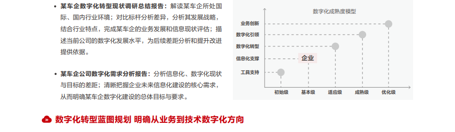 项目启动后,华为云团队先对客户现状进行调研和诊断,通过高层研讨、工厂走访、数字化管理部门调研、职能部门调研,经过对接部门多次验收、客户公司级及领导层汇报,华为云团队明确了某车企当下亟待进一步培育的核心能力,包括产品创新能力、市场管理能力成熟度打分,共同完成: