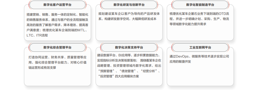 华为云团队协助客户制定符合公司实际情况的数字化实施策略,形成行动方案《某车企数字化建设实施规划》,帮助客户明确建设路径、项目规划、投资估算,围绕着1-3年可成效的速赢成果,输出数字化转型6大应用平台规划建议: