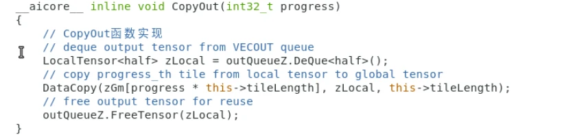 CopyOut:使用DeQue接口从VecOut的Queue中取出LocalTensor;使用DataCopy接口将LocalTensor拷贝到GlobalTensor上。