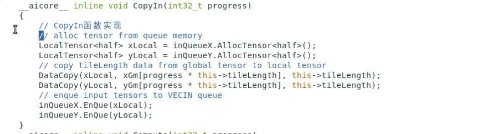 基于矢量编程范式,将核函数的实现分为3个基本任务:CopyIn,Compute,CopyOut。Process函数中通过如下方式调用这三个函数。