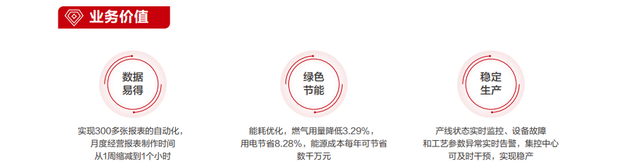 在本次项目中,某制造企业实现了产线窑炉能耗数据的自动采集,做到了数据标准口径的统一,每5秒采集一次数据,可以展示出详细的天然气热值、炉温、用气量等变化曲线。基于准确、可信、详尽的数据,每日呈现所有产线窑炉单耗排名,发现差距,工艺专家基于产线工艺数据对比分析,对能耗较高的窑炉进行工艺优化。在经过数月的持续优化,国内产线窑炉单位产能能耗比基线降低3.29%,每年可节省燃气费用数千万元。