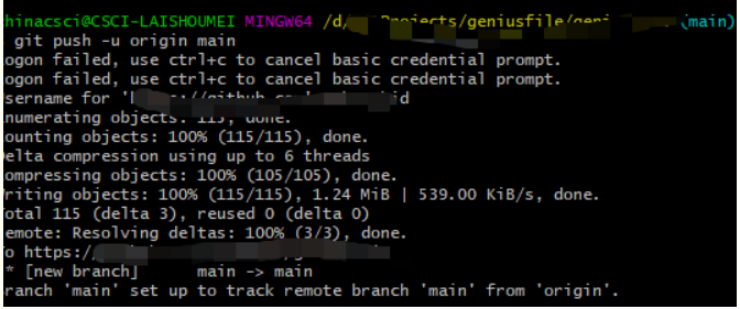 回到git bash 继续提交,在githup登陆弹出框中输入账号密码,第一次输入的是你githup的账号密码,第二次弹出后输入git账号,密码换成刚刚生成的token.