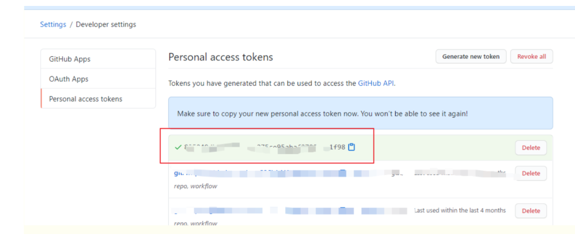 新建完成,页面已经有一个新的token,这个页面先不要动,或者先复制出来,页面刷新后这个token就看不见了
