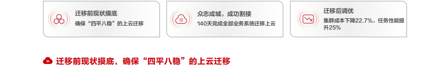 迁移小组团队先将数据迁移至云和搭建对等镜像环境。待部分迁移后,开启任务调试和数据核对双跑。等15个业务系统完成后,再进行全局割接和性能优化。整个搬迁过程,华为云协助客户完成N PB+数据全量搬迁,1w+作业迁移调试,3w+数据表一致性比对。历经140天,完成迁移工作,比预期提前20天。