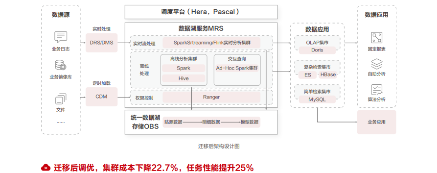 其次,华为云迁移团队在迁移双跑环节,对Spark、pySpark任务的性能进行了深入的调优,解决了数据倾斜、GC、小文件、内存溢出、兼容性等关键性能瓶颈问题,整体任务性能相比较原环境提升25%以上。原平台过旧的组件、引擎做了相应升级,针对任务完成了10000+离线、实时任务的梳理,识别下架300+、优化改造200+,纠正了400+核心任务的依赖关系。在数仓建设方面,梳理了接入层、中间层、结果层共30000+数据表,识别核心表400+张,修复核心数据不一致性问题5个。
