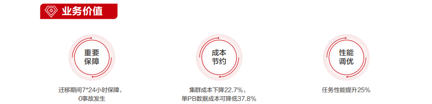 根据设计方案实施迁移后,某生鲜的平台性能和大数据运维性价比均有所提升。从原有存算一体架构转变至云上存算分离架构,摆脱了存储和计算之间的绑定关系,底座从低核CPU转而采用高核鲲鹏裸金属服务器。相较于原环境,集群成本下降22.7%。同时在数据膨胀时,1PB数据成本可降低37.8%,总体性能比呈线性增长。