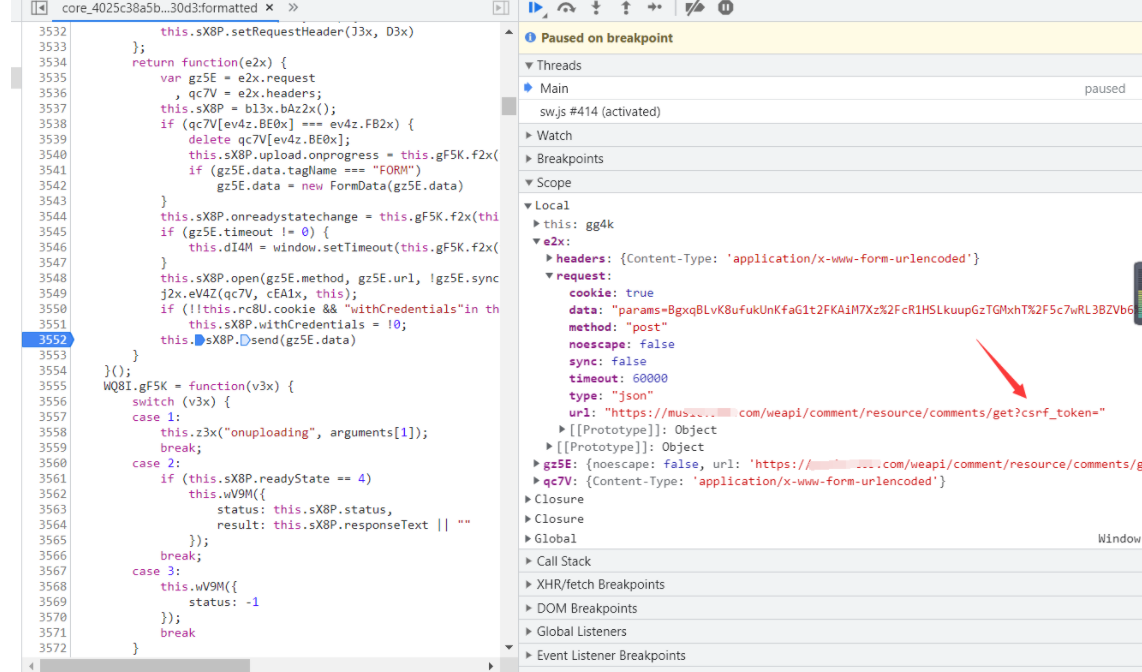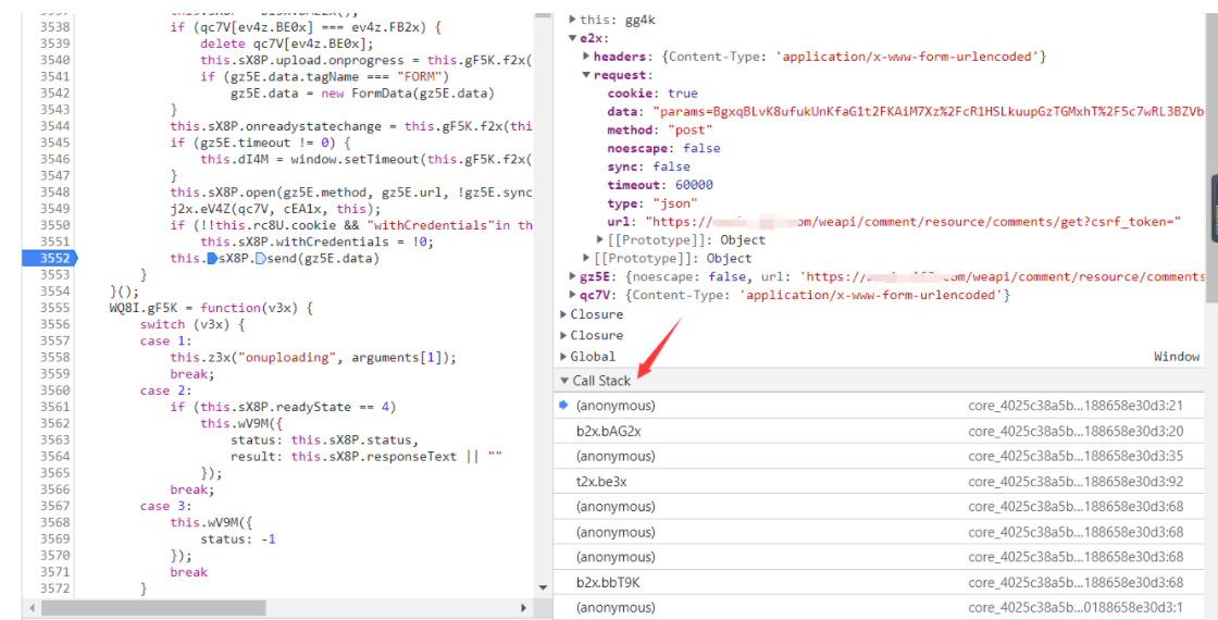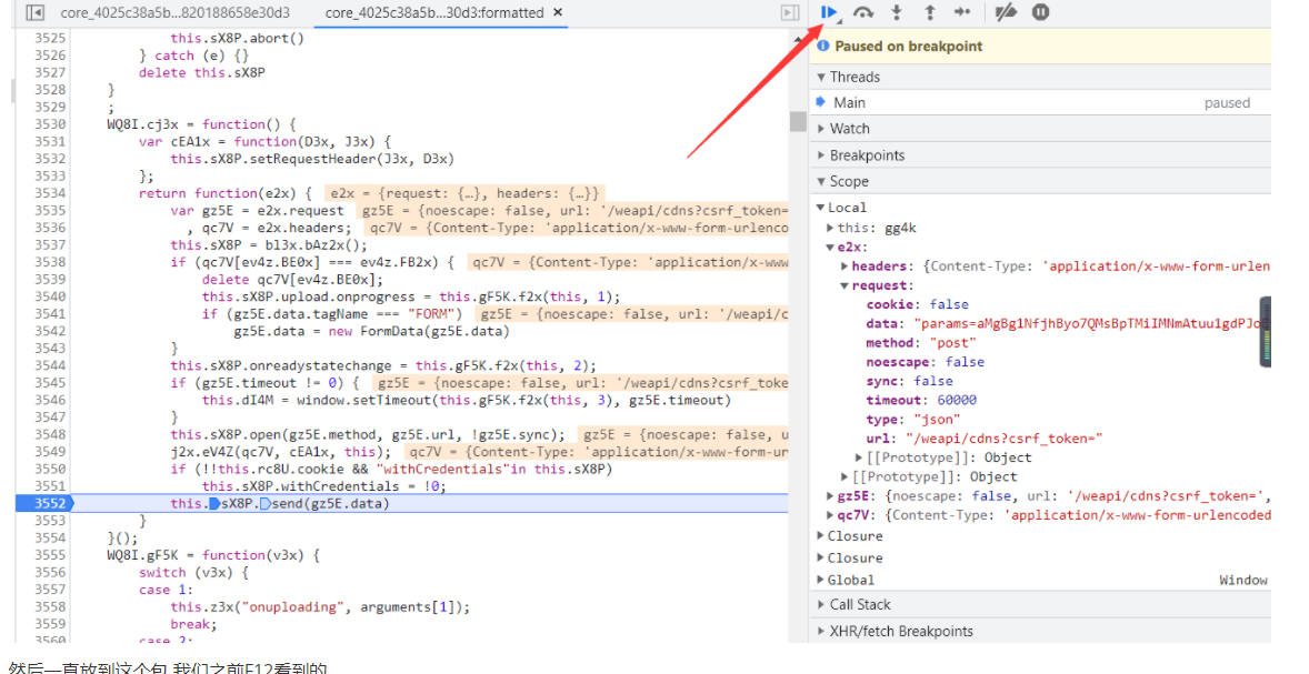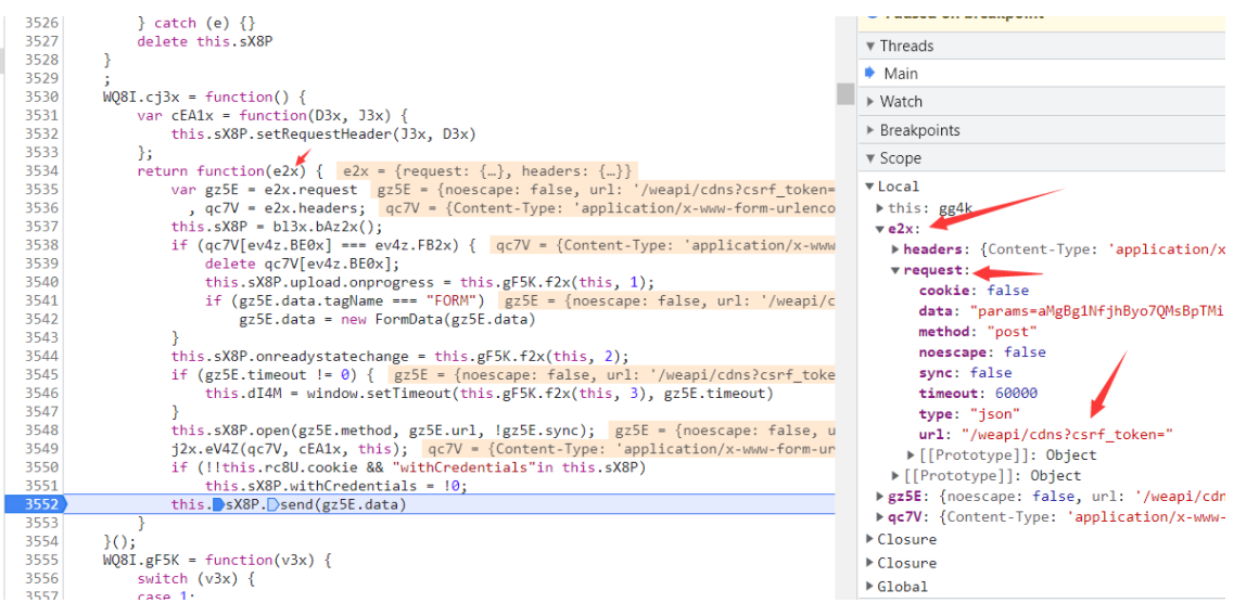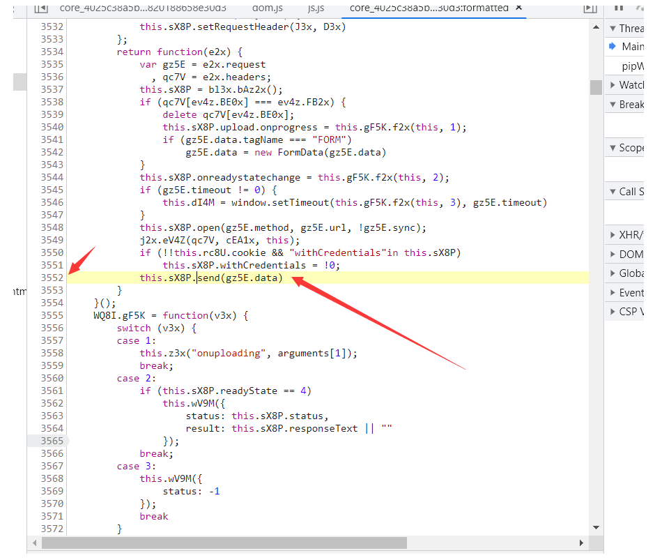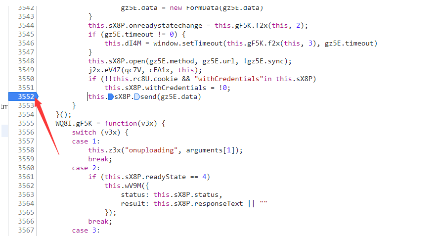 然后会发现这里高亮 这里就是最后发出请求的地方 看代码send也可以看出 然后在3552打上断点