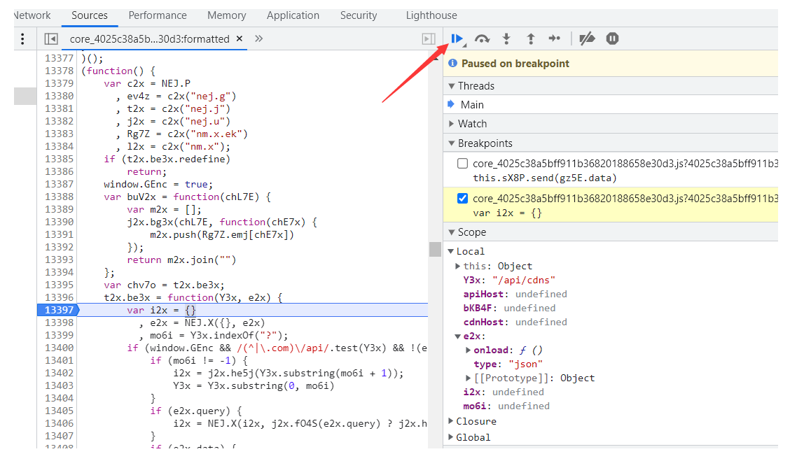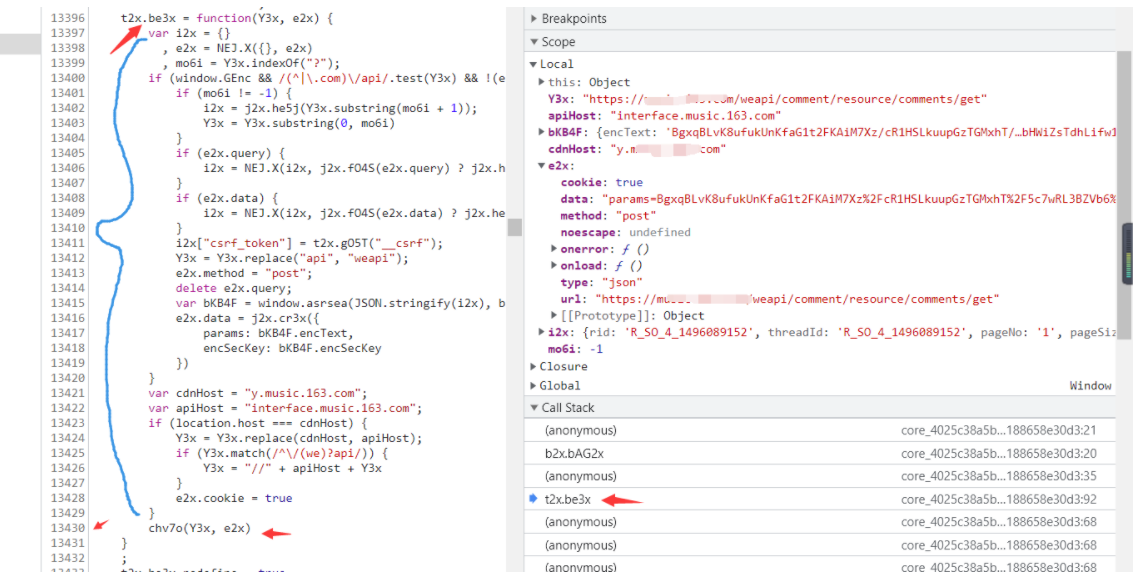 在这个包里面可以看到是已经加密了 相当于运行到13430这一行的时候 参数被加密完了 所以加密过程就相当于在t2x.be3x这个函数内部