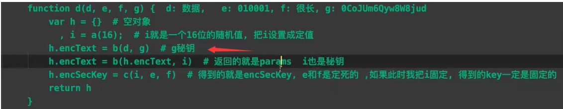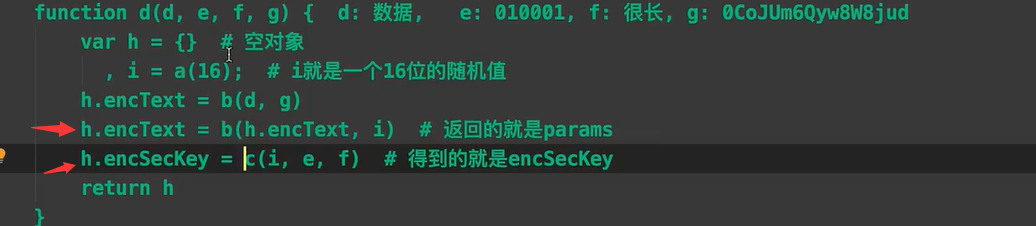 function d(d, e, f, g) { var h = {} , i = a(16); return h.encText = b(d, g), h.encText = b(h.encText, i), h.encSecKey = c(i, e, f), h }