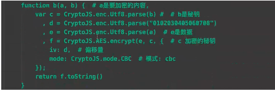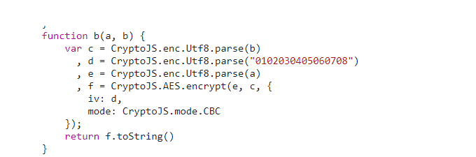 function b(a, b) { var c = CryptoJS.enc.Utf8.parse(b) , d = CryptoJS.enc.Utf8.parse("0102030405060708") , e = CryptoJS.enc.Utf8.parse(a) , f = CryptoJS.AES.encrypt(e, c, { iv: d, mode: CryptoJS.mode.CBC }); return f.toString() }