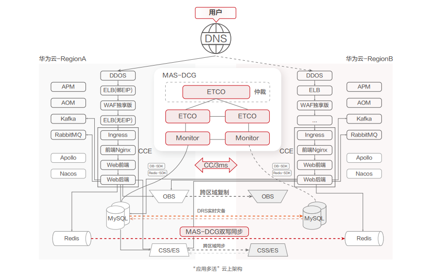 - 应用多活的系统构建上,华为云通过引入MAS-DCG提供“多活仲裁+DB监控+配置中心”等能力,实现机房探测、中间件/数据层探测、仲裁、配置管理等功能。在遇到region级单边故障,可以通过修改接入层DNS,DNS权重将流量引到业务正常的region,来保证顺丰科技系统的业务延续性。